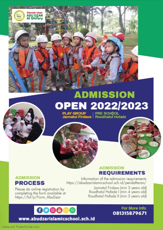 Pendaftaran dimulai sejak tanggal 1 Januari 2022 dengan mengisi formulir pendaftaran secara online. Form pendaftaraan bisa di akses di website Sekolah Islam Abu Dzar Al Ghifary, www.abudzarislamicschool.sch.id